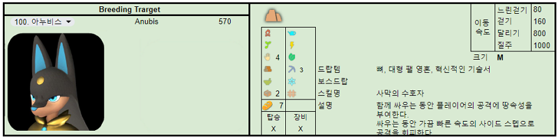 * 추천 아누비스 교배 조합 - 011. 펭킹 + 072. 불무사 / 037. 신령사슴 + 073. 라이버드