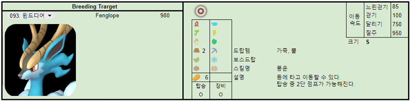 윈드디어도 워낙 많은 교배 조합이 있어서 약한 친구들로만 구성하였습니다. 조합표 보고 본인이 편한 것으로 맞춰가면 됩니다.