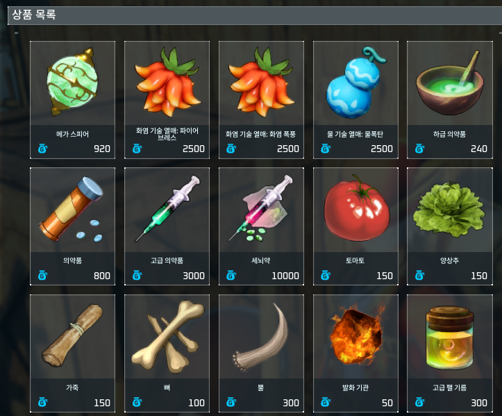 양상추 씨를 제외하고도 기술열매나 메가스피어, 하급 의약품, 의약품, 고급 의약품, 세뇌약 등 다양한 상품을 팔고 있으니 필요한 것들을 구매하면 좋을 것 같다. 사실 의약품의 경우에는 만드는 것보다 구매하는게 더 편하긴 한데 가격대가 생각보다 만만치 않다. 돈을 많이 버는 방법도 생각해봐야겠다.