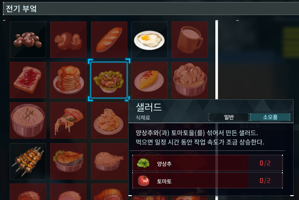게임 1주일이 지났는데 지금에서야 만들기 시작한다는게 부끄럽기는 하지만 그래도 만들어보고 싶다. 샐러드는 작업 속도를 증가시켜주는 부가적인 역할을 하기 때문에 많은 고수분들이 샐러들을 팰에게 먹여 아주 강제 노동을 강하게 시키는 중이시다.