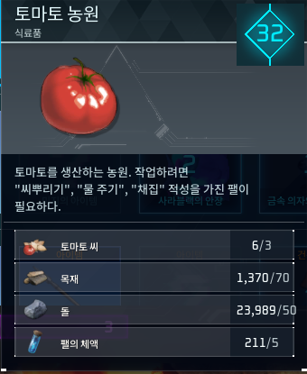 샐러드 음식을 만들기 위해서는 토마토와 양상추가 필요한데, 양상추에 대한 포스팅은 이전에 작성하였기 때문에 토마토 농원만 지어주면 된다. 토마토 농원은 32레벨에 해금되는 기술로 이름 그대로 토마토를 생산하는 농원이다. 씨뿌리기와 물주기 채집 관련된 팻이 존재한다면 자동으로 키우고 채집이 가능하다.