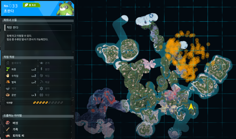 역시 재료는 토마토 씨앗을 구하는 것은 팰을 때려 잡는것 만큼 즐거운 일이 없다. 토마토 씨를 주는 팰들은 많이 있겠지만 가장 낮은 친구를 잡는게 리스크가 없기에 가장 낮은 친구로 데려왔다. 바로 팔월드 33번 팰인 초판다이다. 나오는 구역이 한 군데이며 내가 아직 가지 않았던 곳이어서 토마토 씨가 수중에 없었다보다.