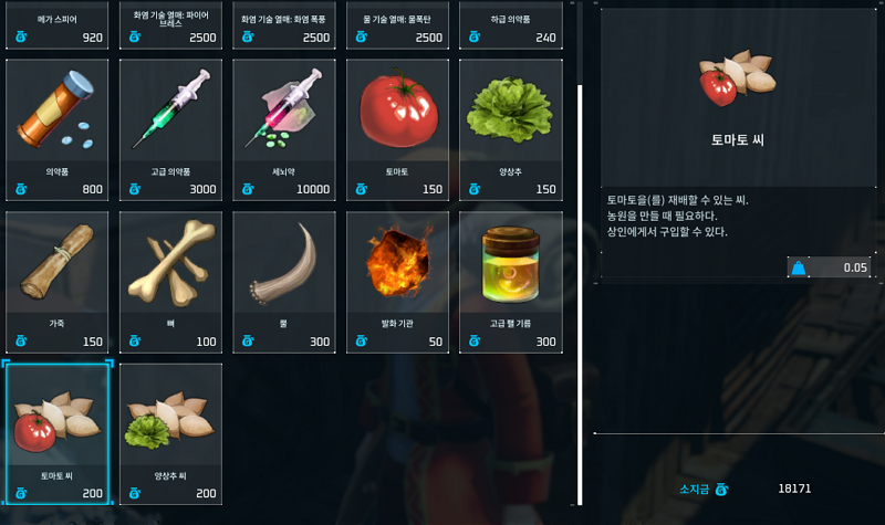 끝자락 어촌에 사는 방랑어촌은 토마토 씨앗을 포함하여 진짜 많은 것을 팔고 있다. 양상추 씨 사러 왔을 때 물품들을 둘러봤고 토마토 씨앗 살 때 필요한 재료들을 좀 구매했다. 일단 시멘트 때문에 뼈좀 구매했고 의약품도 몇 개 사둬서 아이들 좀 나눠줘야겠다. 게임 켜두고 블로그 쓰다보면 아픈 아이들만 늘어나는 것 같다.