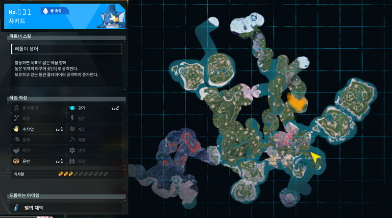 팰월드 팰의 체액의 종결지가 바로 이곳이라고 하는 이유는 두 가지이다. 첫 번째로는 샤키드가 많아도 진짜 너무 많다. 왜이렇게 무리지어 다니는지는 몰라도 진짜 한 부대에 10마리씩은 섞여있는 듯 하다. 샤키드 한 마리를 잡으면 팰의 체액을 3개씩 준다. (보통 난이도는 1개, 댓글로 알려주셔서 감사합니다.) 결국 저 한무리 잡으면 대충 30개씩 먹는다는 소린데 시멘트를 만드는데 넉넉하지 않을까.