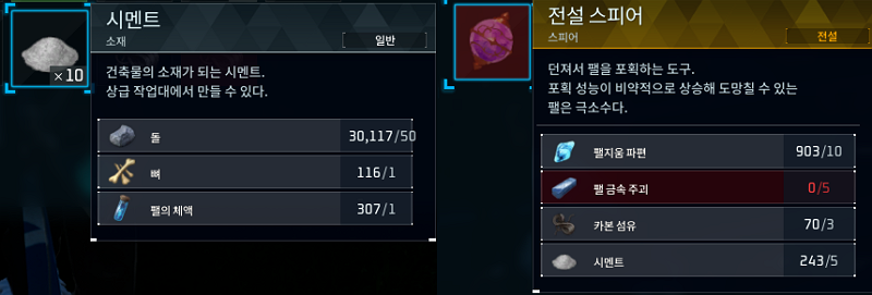 전설 스피어의 경우에는 팰의 체액이 단독적으로 필요한 것은 아니고 전설 스피어의 시멘트가 필요한데 이 시멘트 하나 만들기 위해서는 팰의 세액이 필요하다. 한번 시멘트를 만들 때마다 10개씩 생기니 팰의 액체 1개당 전설 스피어 2개를 만들 수 있다는 뜻으로 해석된다.