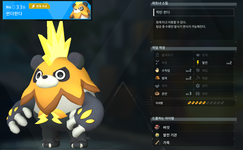 레벨을 50 찍고 와서 미안하다 썬더판다야. 썬더판다의 레벨은 31이며, 너무 늦게 찾아온 나머지 큰 어려움 없이 포획이 가능했다. 번개에 맞는 괴짜라서 번개 데미지를 쏘는데, 추후에 어려움 모드에서 만나게 되면 험난한 피비린내 싸움을 하지 않을까 생각이 된다.