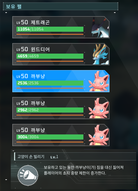 보유팰을 까부냥으로 채워놔서 소지 중량 제한을 더 늘려두었다. 제트래곤을 사용하고 있기에 이제 윈드디어를 빼고 까부냥으로 한 마리 더 채워둬야겠다.