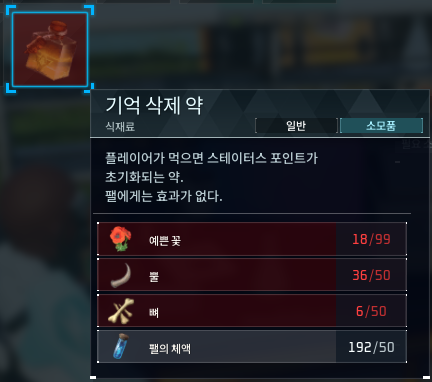 기억삭제약의 경우에는 뭐 크게 재료가 들어가는 것은 아닌데 은근히 뿔과 뼈 모으기가 어렵다. 그래서 그냥 상인한테서 사는 것을 추천드리긴 한다. 그 외에도 예쁜 꽃이 99개나 들어가는데 생각보다 양이 많은 편이다. 예쁜 꽃은 평소 우리가 움직이는 곳에는 존재하지 않아서 별도로 채집에 나서야한다. 예쁜꽃 수집처는 아래 링크를 참고하시면 된다.