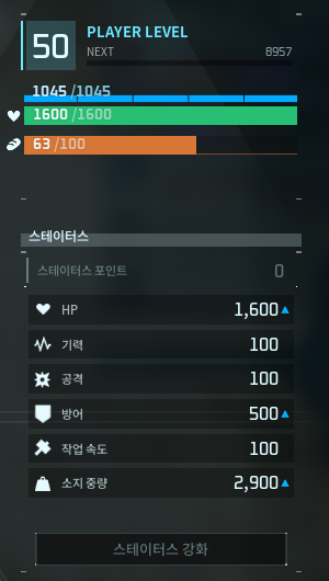 - 스테이터스 우선순위: 소지중량 > 체력 >>>>> 그외