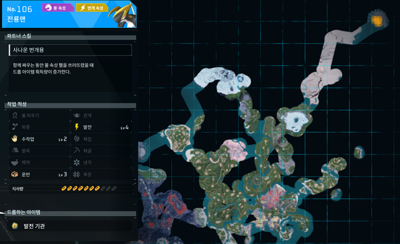 전룡맨이 아마 마지막으로 사용하는 발전 작업적성을 가진 팰이 아닐까. 현재기준으로 팰월드 내 4레벨 발전 적성을 가진 친구가 없기 때문에 거의 최종이라고 생각하면 될 것 같다. 발전기를 빠르게 돌려서 100%로 만들어 놓고 거점에 제일 필요한 수작업과 운반이 각각 2레벨, 3레벨이 붙어버리니 알짜만 가지고 있는 팰이라고 할 수 있다.