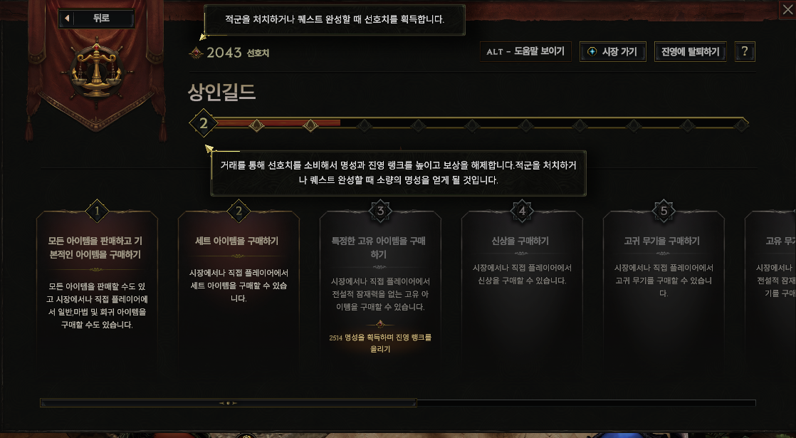 거래가 되어 선호치를 소비한다면 명성이 올라간다. 명성이 올라가면 진영의 랭크를 업그레이드 하고 랭크에 따라서 구매할 수 있는 아이템의 종류가 변경이 된다. 8레벨만 찍으면 어느정도 사람 구실을 할 수 있다고 하는데, 뭐 초반에는 5레벨까지만 되어도 충분하다. 랭크에 따른 아이템 구매는 아래와 같다.
