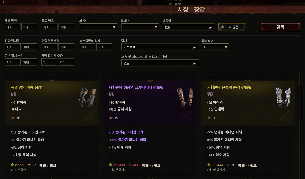 또한, 아직 접사에 대한 이해도가 떨어지는지 몰라도 검색해도 내가 원하는대로 나오지는 않는다. 그래서 시장에서 검색을 할 때는 조금 익숙해진 다음에 도전해보는 것이 좋아보인다. 아무거나 샀다가는 초반에 정말 아까운 선호치를 날릴 수 있다. 그래도 아이템 개수가 워낙 많아서 구경하는 맛이 있다.