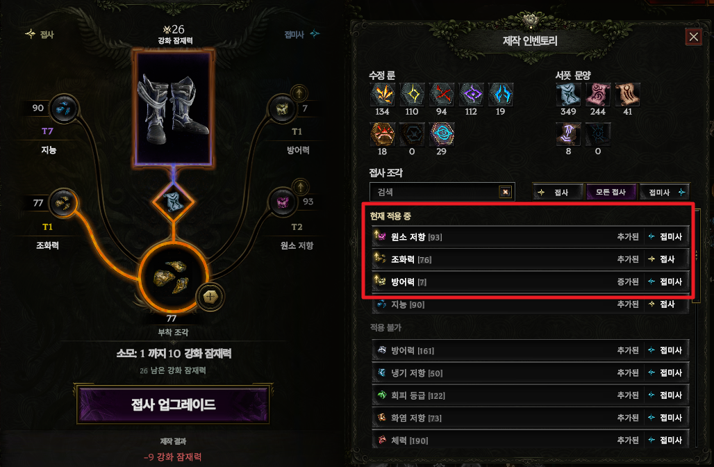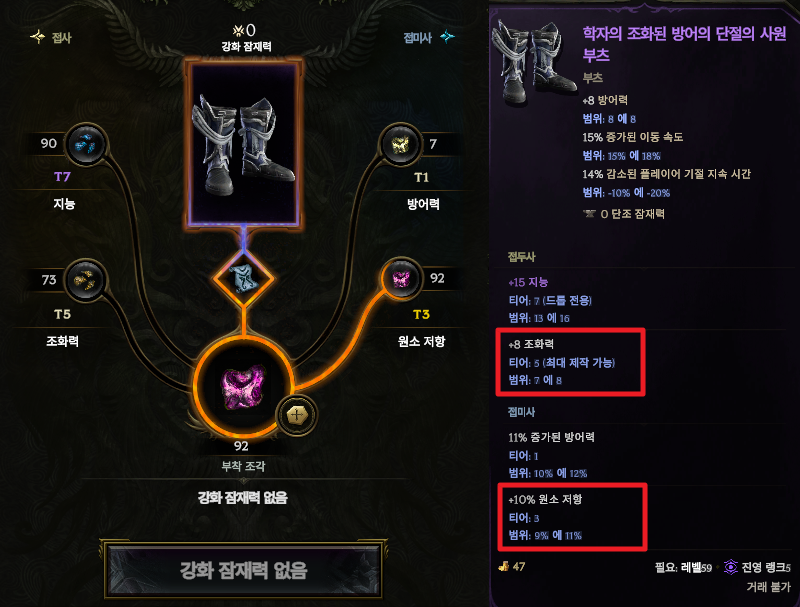 여튼, 약속대로 조화력을 하나 업그레이드를 했고 강화 잠재력이 9가 깎였다. 남은 강화 잠재력으로는 뭘할까 고민해봤을 땐 조화력을 T5까지 올려보고 싶어서 시도를 진행했다. 그리고 잠재력이 좀 남아서 원소 저항도 올려주었다. 아주 으뜸 오션은 아니지만 내 아이템 제작 연습장으로 쓰기에는 참 좋았던 것 같다.