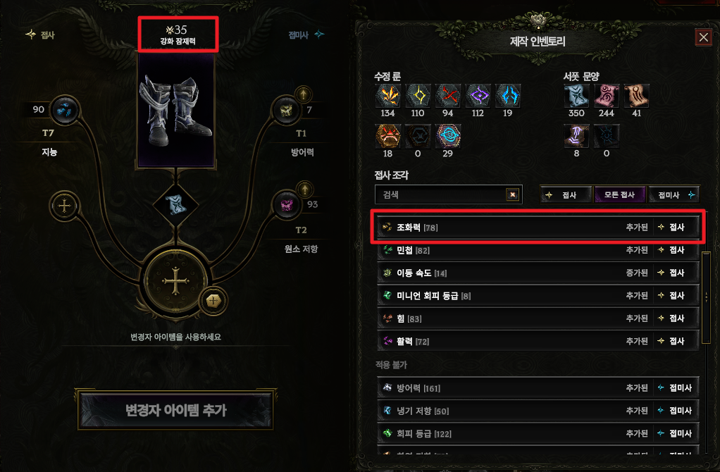 능력치 3개 아이템의 경우에는 한 칸이 비어있기 때문에 접사가 비어있다면 접사 중 하나를 추가할 수 있고 접미사가 비어있다면 접미사 조각 중 하나를 업그레이드 할 수 있다. 나는 조화력 접사 조각을 추가해서 이 신발에 작게나마 도움을 주려고 한다.