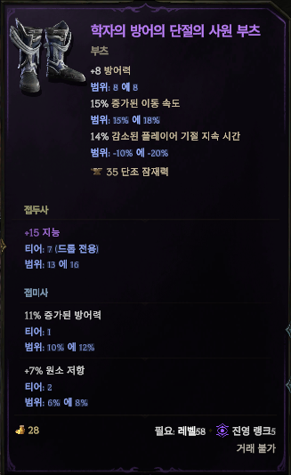 그렇게 만든 내 첫 작품은 아주 귀여운 단전의 사원 부츠가 되었다. 사실 더 좋은 능력치들도 많았지만 아직 운명의 링 레벨도 낮고 게임 시간도 그렇게 많이 하지 못해서 좋은 아이템들이 없는게 문제다. 이렇게 능력치 3개짜리 아이템을 조합해서 조화력도 5티어 짜리로 붙여 두었고 원소 저항도 티어 1개를 올려두었다.