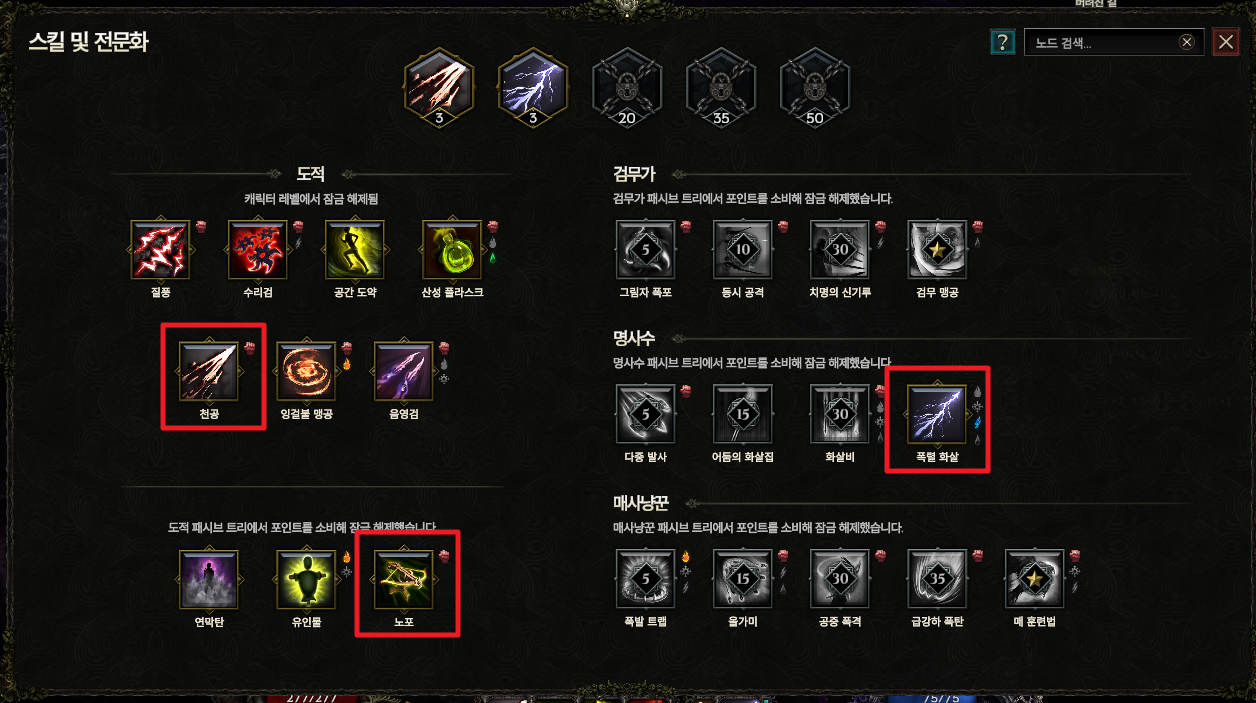 최종 베이스 공격인 폭렬 화살은 스킬 전문화에 넣어서 사용중이다. 당연히 참조하고 있는 상기 링크에 맞는 스킬 전문화 트리를 활용해서 찍고 있다. 이렇게 일단은 폭발 트랩까지 레벨업을 하는 목적을 가지고 있다. 다만 천공이 더 강해서 그냥 전문화 올리는 용도로만 사용할 뿐 주력 딜링으로 쓰기에는 아직 무언가 부족하다.