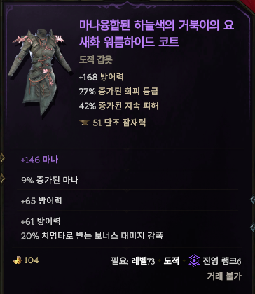 애도의 서리가 생각보다 딜을 뻥튀기 시켜주는게 정말 좋은 아이템이다. '민첩성 포인트마다 공격 및 주문 냉기 피해 +1'을 주는데, 그에 따라 1당 -1%의 저항력을 깎는다. 그래서 물리와 냉기 저항은 생각보다 많이 올려줘야한다. 그래서 아이템에 물리와 냉기 저항이 붙는 친구들은 꼭 가져가고 있다.