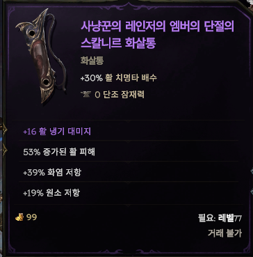 추후 고유 활(겨울의 치세)을 사용할 때 냉기 피해가 적용되기 때문에 폭렬 화살과 폭발 트랩을 모두 냉기 데미지로 전환을 하여야하고 폭발 트랩을 투척에서 활 공격으로 변경하여 아이템 옵션의 효율을 단순하게 만들어 딜을 끌어내고 있다. 물론 젤코르의 폭발 나이프라면 이야기가 달라지겠지만, 애초부터 활 빌드를 하려고 해서 이 방식대로 해보고 있다.