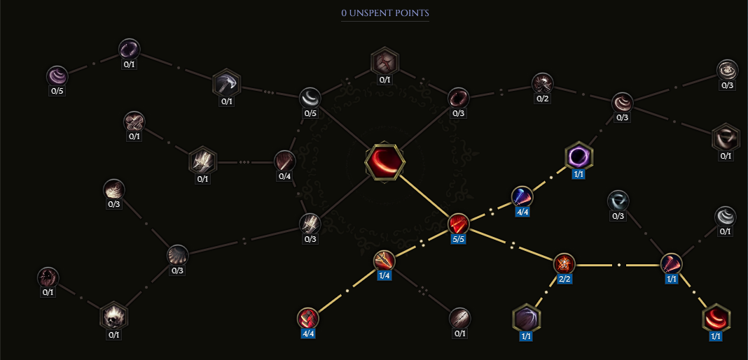 총 6개의 스킬을 사용하나 치유의 손은 패시브로 사용하기에 스킬창에는 넣지 않고, 이동기의 돌격 스킬은 사용은 하지만 전문화를 찍지 않는 방식으로 운영이 된다. 최종 스킬 트리는 아래와 같다. 순서는 상관이 없다 :)