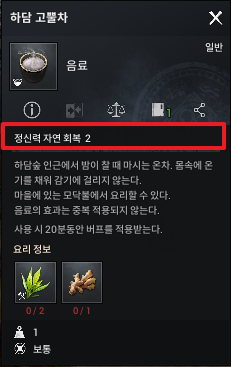 문제는 정신력 자연회복 2를 위해서 이런 수고로움을 해야하는가이다. 워낙 귀찮을 것을 잘 하지 못하는 성격이라 아마 하담 고뿔차나 하담 냉차 정도는 그냥 자연회복의 방식이 있구나 하는 것이지 만들지는 않을 것 같다. 우리의 시간은 소중하니까 말이다.
