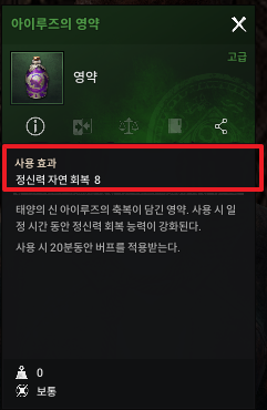 잡화 상점에서 은화로 4000원에 구매할 수 있는 아이루즈 영약이다. 20분동안 버프를 적용받기 때문에 꽤나 많은 영약을 사야하기는 하지만 후반부로 갈 수록 은화가 남아돌 가능성이 있기에 꽤나 메리트 있는 영약이 아닐까 생각이 든다. 정신력 8을 자연회복 시켜준다니 이만큼 달달한 아이템이 또 있을까?