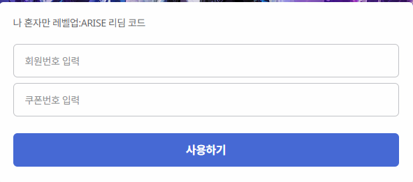 나 혼자만 레벨엄 ARISE 리딤코드 웹 페이지는 아래와 같다. 상기 설정에 보면 본인 ID가 있는데 해당 ID를 복사 후 쿠폰번호를 입력하면 완료가 된다. 공식 홈페이지에서 떠돌고 있는 쿠폰 번호 중 사용이 불가능한 것들도 있어서 직접 사용해보고 올려보는 중이다.