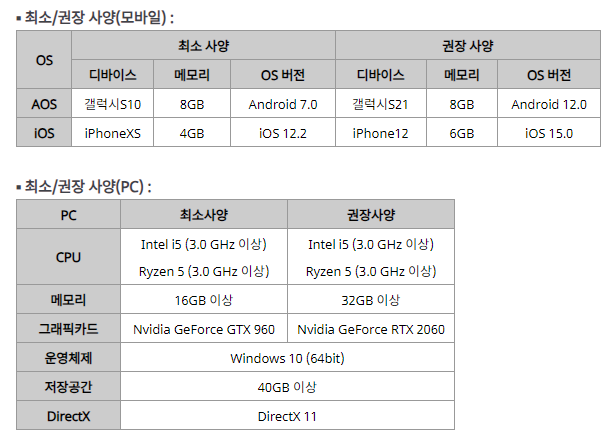 그만큼 그래픽을 많이 잡아먹는다는 소리와도 같은데, 최소사양이나 권장사양을 보면 그리 낮지 않은 것을 알 수 있다. 보통 모바일 게임을 PC로 돌리다보니 모바일로는 거의 하지는 않는다. 아마 발열이 심하지 않을까 생각이 되는데, PC 사양도 권장이 RTX 2060인 것을 보면 생각보다 사양이 좋아야 한다. (폰이 뜨겁다는 대화창이 많이 올라온다)