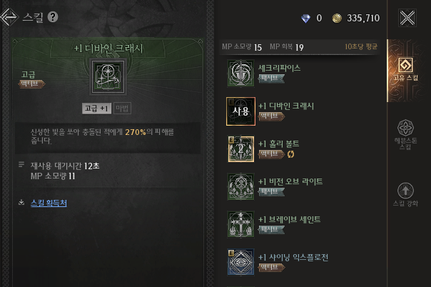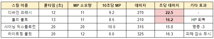 일단 기타 효과들도 많기는 하지만 초당 데미지 기준으로 계산 하였으며, 기타 효과 중에서 HP 회복을 시켜주는 홀리 볼트는 꼭 가지고 가고 싶었다. 기타 효과가 없는 디바인 크래시 의 경우에는 초당 데미지가 강하기도 해서 그냥 사용하기로 하였다. 그래서 샤이닝과 라이트링 불릿은 비활성화로 사용하고 있다.