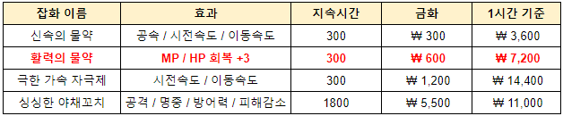 레이븐2 유저 중에서 무소과금에게 MP 마나 회복을 커버할 수 있는 거의 마지막 방법이라고 생각하는 것이 활력의 물약을 먹는 것이지 않을까? 1시간 기준 7,200 골드만 있으면 MP 회복 3을 해주는 아주 완소 아이템이긴 하다. 하지만 초반 골드가 매우 부족한 상황에서 이걸 풀로 먹을 수 있는 분들은 과금러들 뿐이지 않을까 생각이 든다.