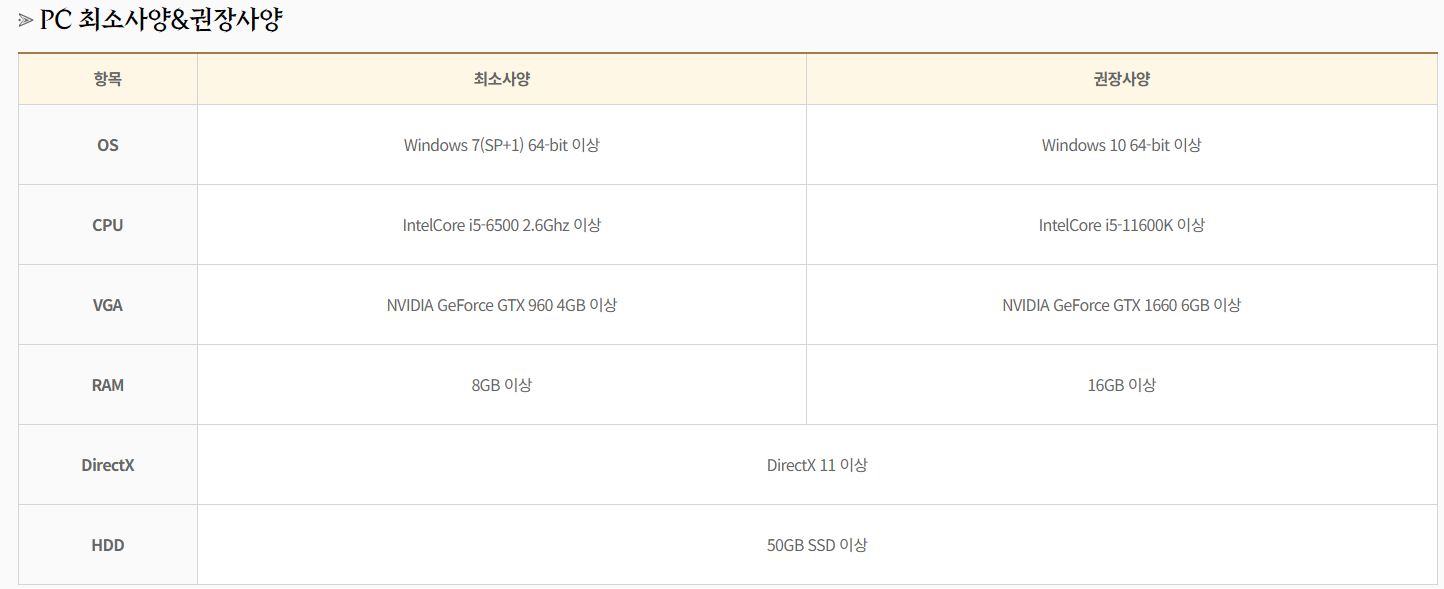근데 사실 최소사양이나 권장사양 다 의미 없다. 최적화의 여부나 실시간 대응에 따라서 천차만별이기에 그냥 이런 식이구나만 알아두면 되지 않을까.