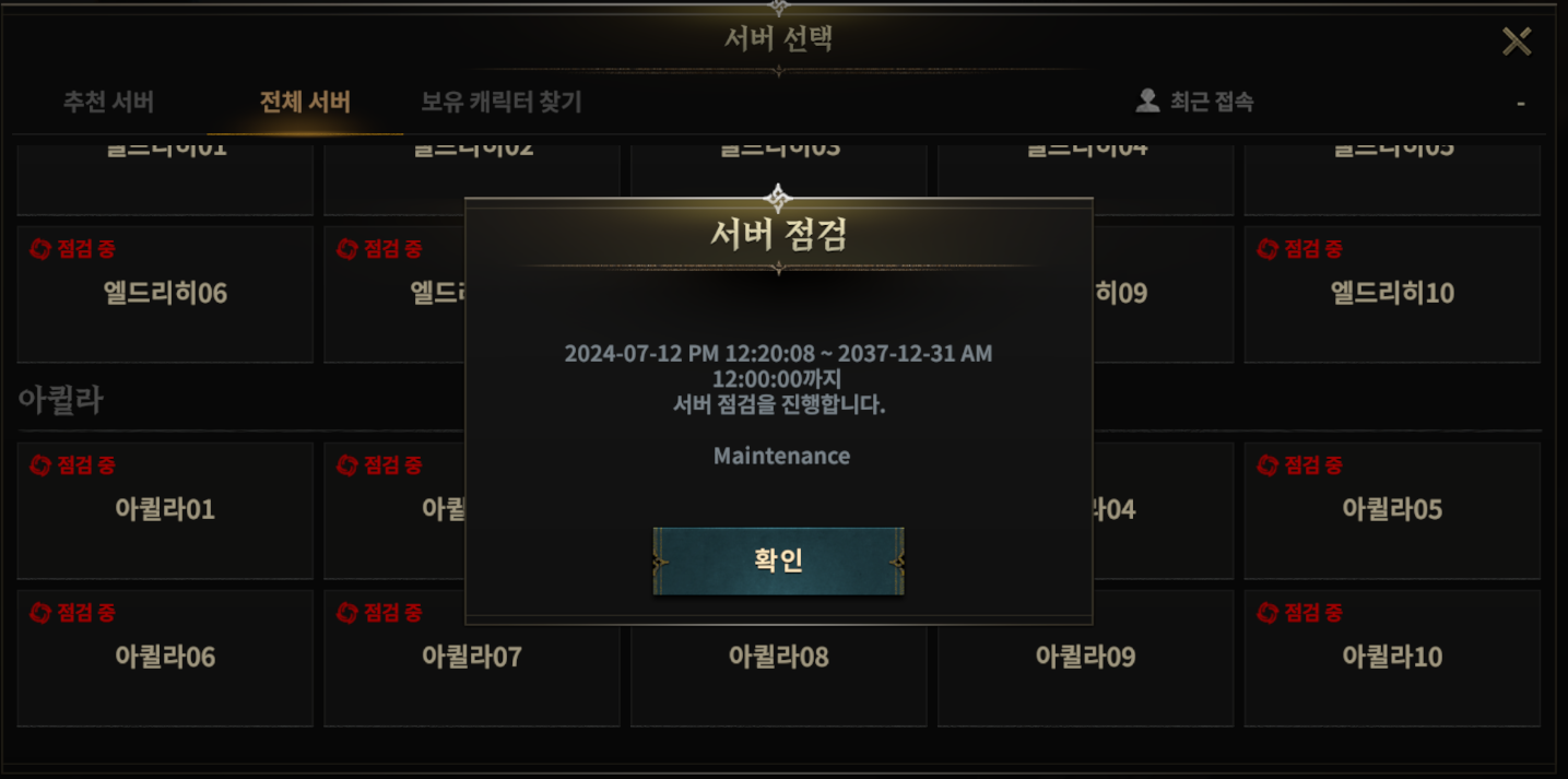서버 점검 시간도 37년 12월 31일이라고 공지를 해두었으니 쉽게 점검이 풀릴 것 같지는 않다. 솔직히 서버 비용이 만만치 않아서 여유롭게 준비하지 못할 것이란건 다 알고 있지만 그래도 이건 너무 심한 거 아닌가 싶다. 그래도 괜찮다. 게임만 재미있으면 뭐 충분히 감당이 가능한 부분 아니겠는가.