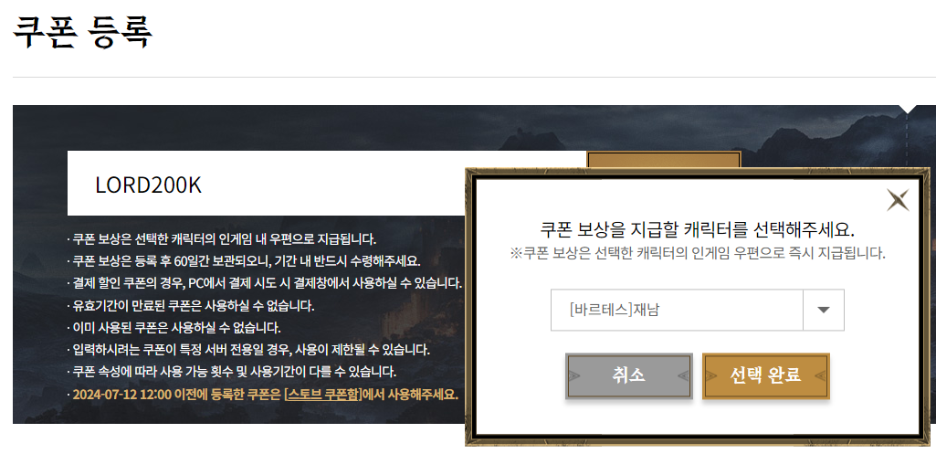 쿠폰 번호를 입력 후에 등록을 누르면 쿠폰 보상을 지급할 캐릭터를 선택하는 창이 나온다. 보통은 한 캐릭터만 키우기 때문에 일반 유저의 경우에는 별다른 이슈 없이 진행이 가능하지 않을까 싶다. 알고 계시겠지만 누가봐도 간단한 쿠폰 번호는 다른 아이디에도 사용이 가능하니 참고바란다.