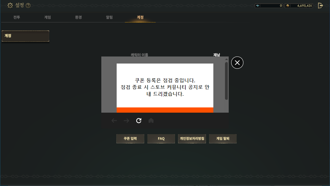 다만, 인게임내 쿠폰 등록은 게시글 작성 기준으로는 점검중이기 때문에 이용할 수는 없다. 차라리 잘 되었다. 어차피 이용도 안할거 점검이기에 못하는걸로 마무리하자. 정상적으로 이용시 포스팅 내 언급하도록 하겠습니다.
