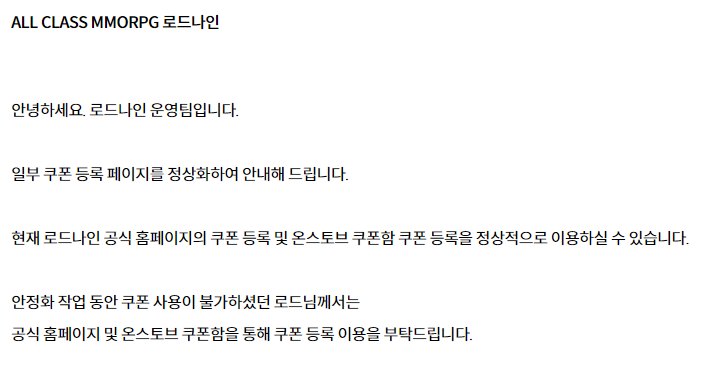 아마 로드나인을 접는 순간까지는 쿠폰 번호를 추가할 예정이니 언제든지 오셔서 확인이 가능하며, 헛걸음하지 않으시도록 최신화한 날짜를 적어두려고 한다. 어차피 아이템을 뿌릴거면 우편함에 소매넣기를 하는 형식이 대부분이기 때문에 걱정할 필요는 없어보인다. 쿠폰 번호의 별도 기간이 작성되지 않은 경우는 공지되지 않았거나 기한이 없음을 나타냅니다.