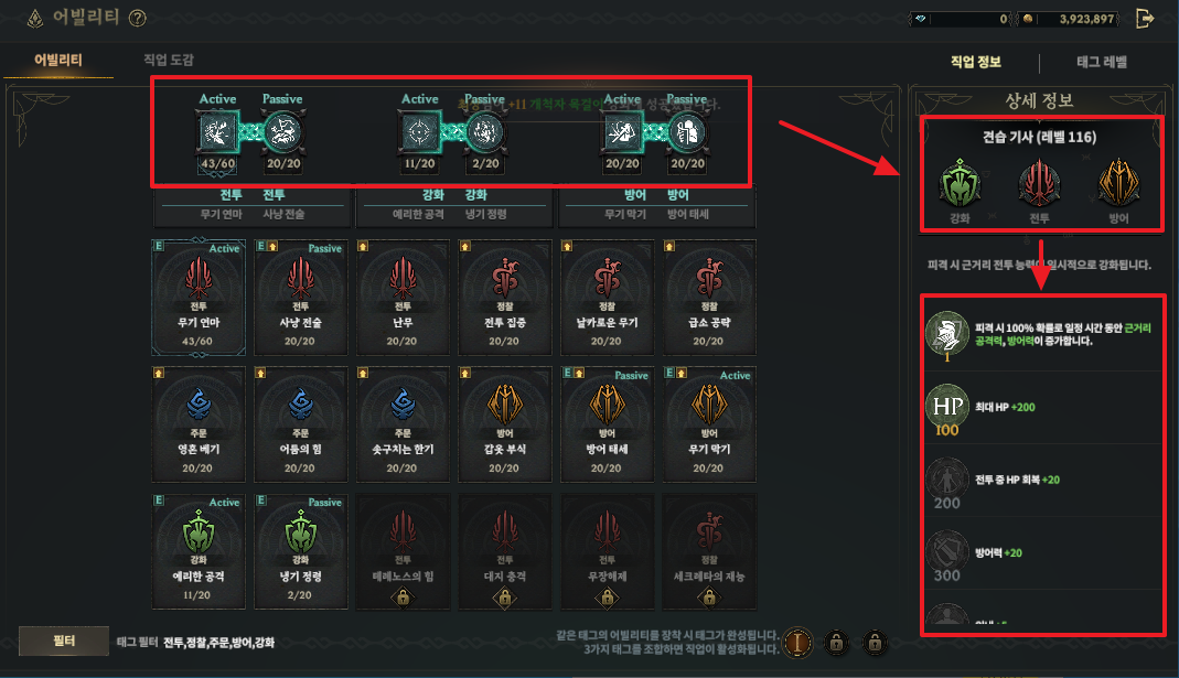 각 직업은 레벨별로 능력치가 증가하는데, 각 태그를 2개씩 장착한 3세트로 이루어져있다. 이 모든 어빌리티의 합이 내 직업의 레벨이 된다. 예를 들어 현재 전투 어빌리티 레벨 43과 20, 강화 어빌리티 레벨 11과 2, 방어 어빌리티 레벨 20과 20을 합쳐서 총 116이라는 레벨이 되는 것이다. (아래 빨간색 창 참고)