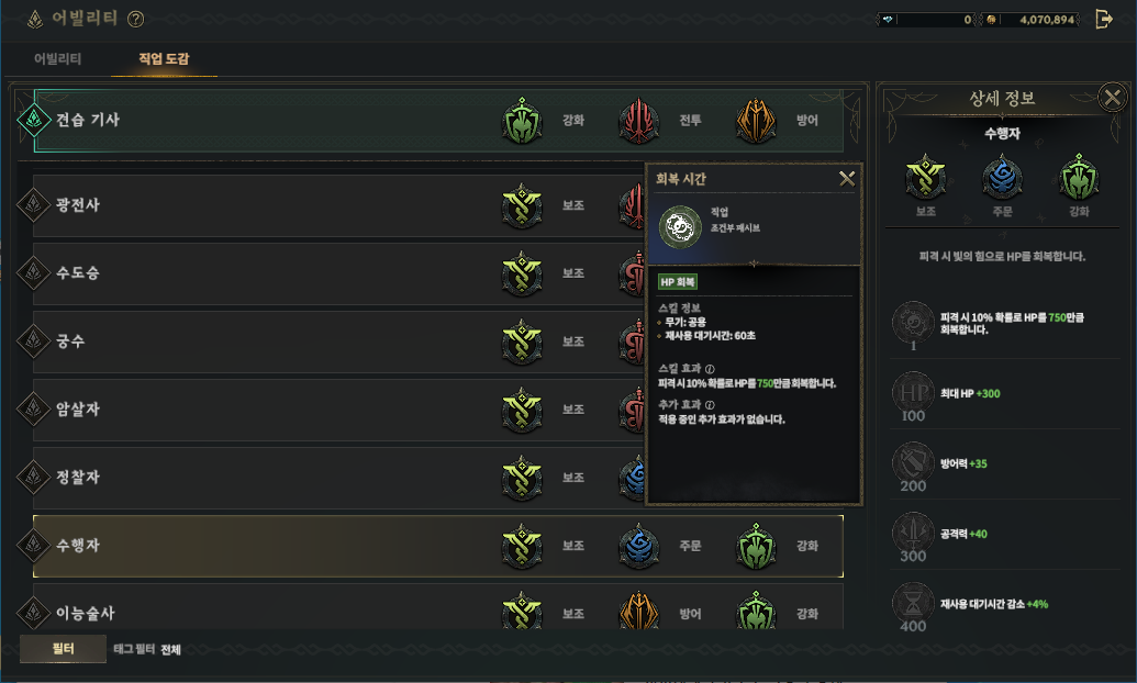 참고로 지금 커뮤니티에서 제일 추천하는 직업이 바로 수행자이다. 몬스터의 공격력이 너무 아프기 때문에 힐링력을 극대화하여 죽지 않고 버틴다는 마인드로 나오고 있는 직업군인데, 참 아이디어가 좋은 듯 하다. '보조 + 주문 + 강화' 조합으로 만들어진 직업군으로, 피격시 10%로 확률로 HP 750만큼 회복하는 기본 스킬을 가지고 있다.