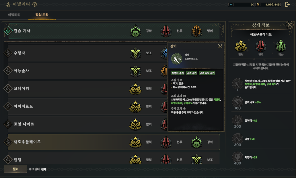 내가 활쟁이이기 때문에 내 마음대로 한 번 조합을 짜보았다. 다른 직업군들도 이런 방식으로 조합을 짜볼 수 있지 않을까? 일단 내가 활쟁이로 하고 싶은 직업은 바로 '섀도우 블레이드'이다. 섀도우 블레이드 말고도 좋은 조합들이 많겠지만 이 친구를 선택하게 되었다. 섀도우 블레이드의 능력은 치명타 적중 시 치명타와 치명타 피해 그리고 공격속도가 3초간 증가한다. 쿨타임도 10초라 굉장히 빠르게 발동이 가능하다.