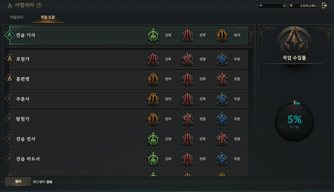 각 태그를 가진 어빌리티는 전투, 정찰, 주문, 방어, 강화는 총 6개씩 보조, 활력, 재주는 총 8개씩으로 총 54개로 이루어져 있다. 각 어빌리티는 보스를 잡거나 몬스터를 잡으면 드랍이 되며 각 어빌리티를 클릭하면 드랍 장소를 확인할 수 있다. 결국 초반부터 원하는 직업을 하지는 못하고 게임을 해 나가면서 얻어야하는 입장이다.