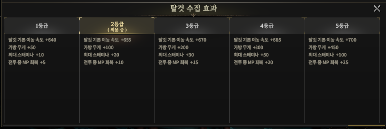 탈 것 수집효과는 이동속도와 가방 무게 그리고 전투중 MP 회복 등 작고 귀여운 스탯을 주지만 그래도 무과금에게는 아주 큰 능력치라고 할 수 있다. 탈 것 상인에게 가면 전투마, 날쌘, 야생 늑대, 전투 늑대 총 4마리의 탈 것은 구매할 수 있으며 총 310만 골드가 필요하다.