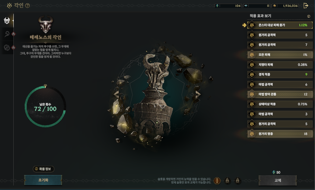 참고로 각인은 다음 단계를 해방하면 이전 단계의 능력치를 바꿀 수 없기 때문에 신중하게 다음 단계를 오픈해야하는데 그것도 모르고 그냥 다 열어버려서 몇 개의 능력치는 쓰지도 못하게 되었다. 초기화를 하면 좋겠지만 시간의 조각이 반환이 안되어서 그냥 어느정도 능력치에서 타협해서 써야할 듯 하다.