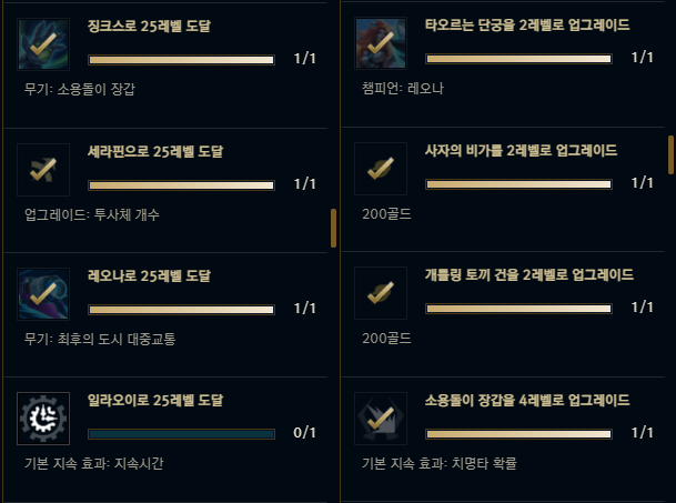 임무 목표 중에서 '적에게 치명타 적중 4만회' 목표가 있다. 이 임무는 다른 친구들로 깨려고 의도적으로 할 필요는 없고 야스오의 패시브 낭인의 길로 금방 채울 수 있다. 치명타가 올라갈 수록 도움이 되는 야스오는 치명타 확률 15프로를 가지고 움직이기에 생각보다 엄청나게 빠르게 임무를 채울 수 있다.