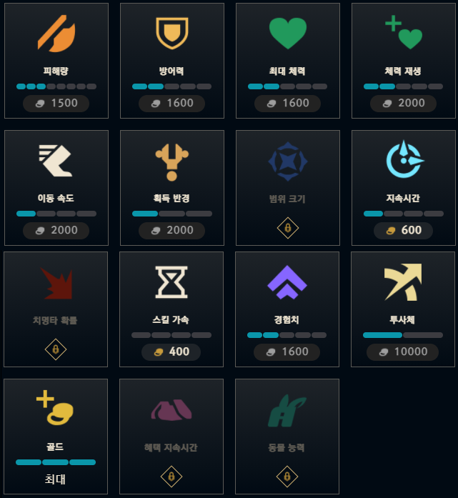 * 만렙 고수분이 생각하는 주요 능력치는 골드>경험치>가속>치명타or 투사체 순서라고 한다.