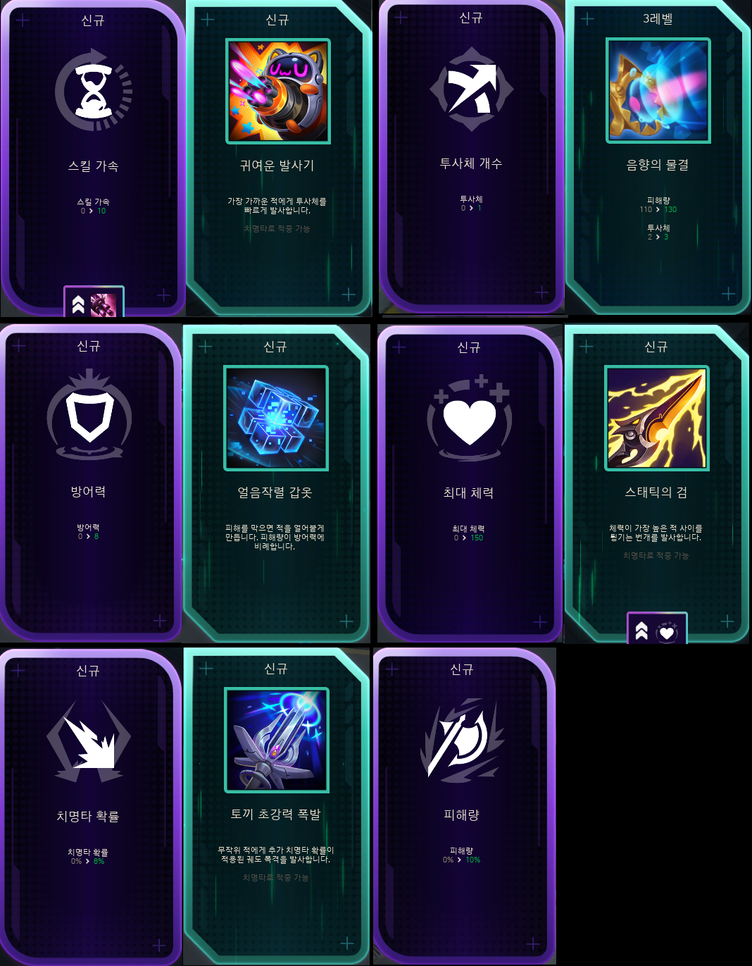 아니 세라핀이 원거리 딜러인데 왜 영점 사격을 집는가? 그냥 먹으면 옆에서 때리면 된다. 아니면 장거리를 먹어서 멀리서 때려도 된다. 뭘 먹어도 상관 없으니 부족한 딜링을 끌어올릴 수 있는 공격 관련한 패시브도 좋다. 다만, 체력을 줄여주면서 이득을 주는 것들은 잘 먹지 않게 된다. 물론 좋기는 하지만 끔살 당할 수 있고, 또 기본 스킬 쉴드량에 영향을 주기 때문이다.
