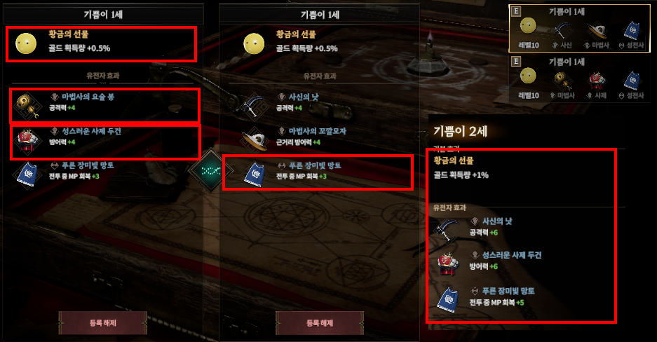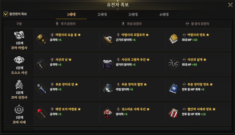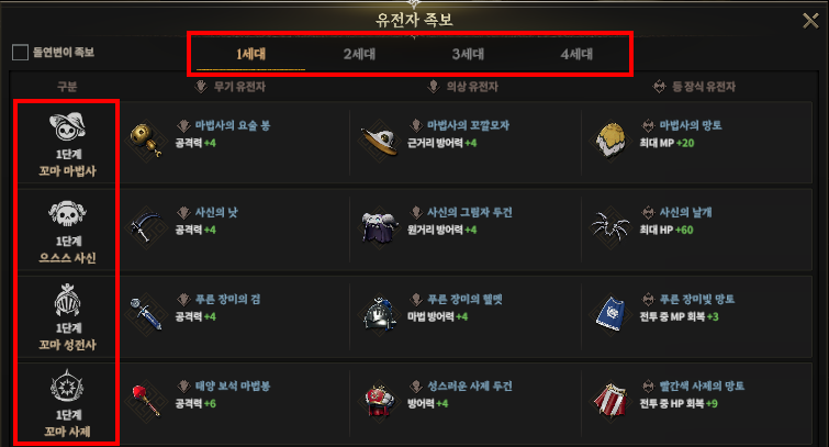 처음에는 나도 마법사가 나오면 모두 마법사가 나오는 것인 줄 알았으나 유전자가 엄청 지저분하게 섞이는 것을 확인할 수 있다. 유전자는 총 1단계부터 11단계까지 존재하며, 등급이 높아질수록 수치가 높아진다. 예를 들어 1단계 유전자는 깡 공격력이 +4인 반면에 7단계 유전자는 +36이 된다. 높은 단계, 즉 태생부터 잘 뽑힌 친구들이 스탯이 높다.