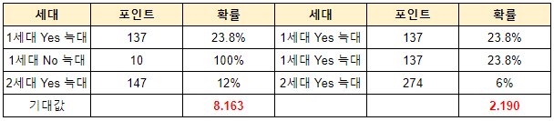 아래 표는 그냥 단순 계산이므로 오차가 매우 클 것 같다. 1세대 늑대옵션이 있는 호문과 1세대 10포인트로 뽑은 재물을 합치는 방법으로도 해보고 1세대 늑대 옵션만 있는 친구들로만 해보는 것도 진행해보려 한다. 단순 계산 값으로는 1세대 늑대와 재물 하나를 사용해서 진행하는 것이 포인트를 아끼고 기대값도 높아지는 것을 알 수 있다.