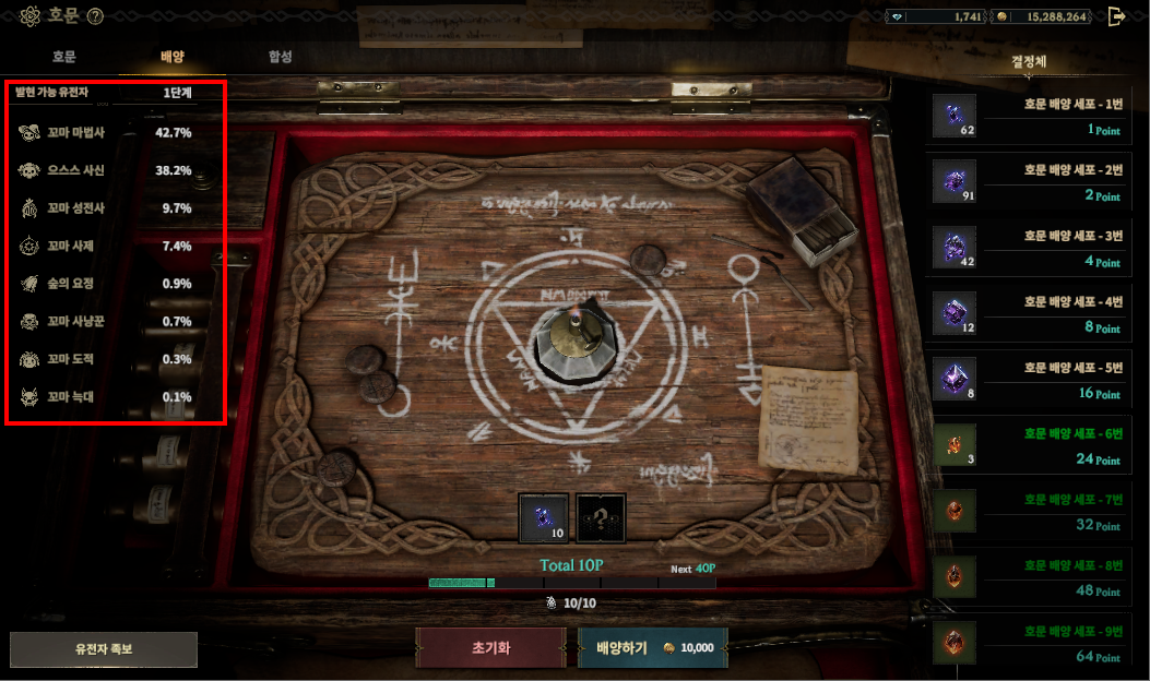 호문 배양 시 포인트별로 확률이 모두 다르다. 각 단계마다 5개의 단계가 있으며, 해당 단계마다 발현되는 유전자는 조금씩 달라진다. 아무리 배양 세포를 많이 가지고 있다고 하더라고 배양세포를 10개밖에 넣지 못하기 때문에 초반에는 2~3단계 유전자를 노리고 유전자를 노린다.