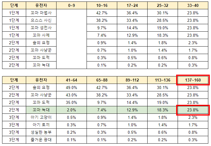 꼬마늑대는 2단계 유전자이며, 아래 표처럼 137개의 배양세포를 맞춰서 배양해야지만 가장 높은 효율을 자랑할 수 있다. 10개의 포인트를 넣어서 꼬마 늑대가 나올 확률은 0.1%, 137포인트를 넣어서 꼬마 늑대가 나올 확률을 23.8%. 포인트는 14배 정도 차이나지만 확률은 무려 248배 차이가 난다. 본인이 뽑고싶은 유전자를 선택했다면 확률에 의해 최적의 포인트를 찾아야한다.