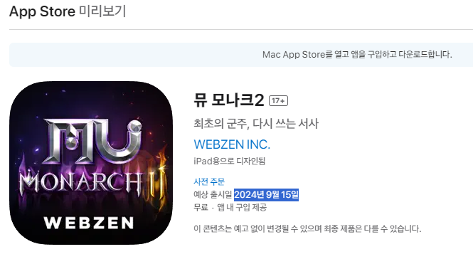 신규 게임 일정은 사실 게임사가 알려주지 않으면 알기는 쉽지 않다. 오피셜이 뜨지 않는다면 약간의 편법으로 출시일을 유추할 수 있다. 뭐, 다양한 방법이 있겠지만 이번에는 App 스토어에 등록되어 있는 뮤 모나크2에 작성되어있는 출시일로 가져와보았다.
