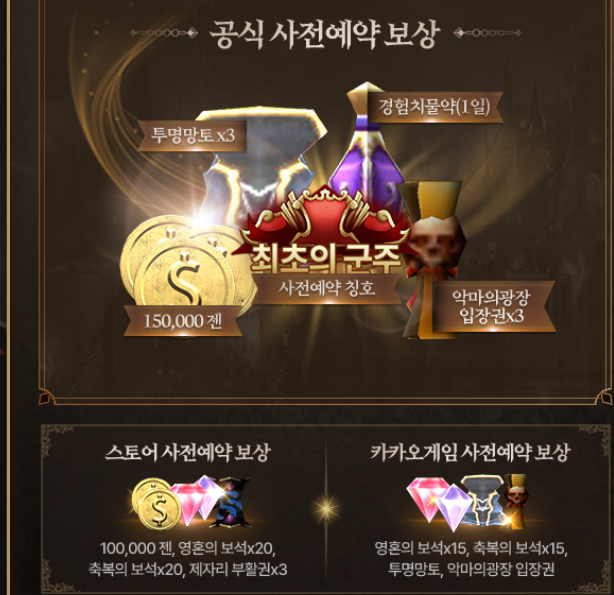 추첨이나 강화 이런 요행을 바라는 것은 거의 안하기 때문에 안전하게 받을 수 있는 보상은 총 3개이다. 공식 사전예약 보상과 카카오 게임 사전 예약 그리고 스토어 사전 예약 보상이다. 사실상 공식 사전예약하고 스토어 사전 예약의 경우에는 그냥 다 주는 경우도 있지만 카카오 게임 사전예약 보상은 카톡으로 오기 때문에 무조건 해야한다.