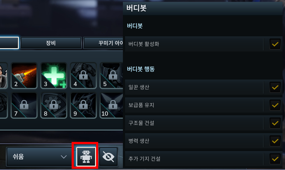 '메뉴 - 옵션 - 버디봇'에 들어가면 활성화를 On/Off를 할 수 있으며, On 상태에서도 버디봇의 행동을 제한할 수 있다. 일꾼 생산이나 보급품 유지 정도만 해두면 게임이 엄청 편하다. 하지만 추후 설명할 단축키를 연습하려면 모두 끄고 플레이하는 것도 나쁘지 않아보인다. 조금 바빠야 시간도 잘 가기 때문에. 성향에 따라 상황에 따라 취향에 맞게 선택하면 된다. 안쓴다고 손해보는 것도 쓴다고 손가락질 할 사람도 없다.